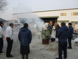今年も恒例のとんど焼きを行い、会社に飾ってあった門松やしめ縄はもとより、各家庭の正月飾りも持ち寄って焚き上げました。 そして、燃え上がる炎や立ち上る煙に今年一年間の安全や無病息災の祈りを込めました。 今年一年無事で過ごせますように。また、皆様方にもとんど焼きの御利益がございますように。