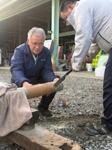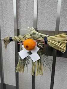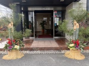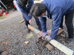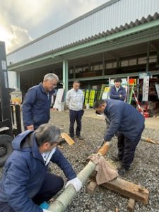 今年は恒例の門松づくりに土木部から若手2名と技能職から1名が参戦してもらいました。 若手ならではのパワーと技能職ならではののこぎりさばきで手際よく立派な門松が出来あがりました! 他にめがねや鏡餅等の準備も終わり、新しい年を迎える準備ができました。